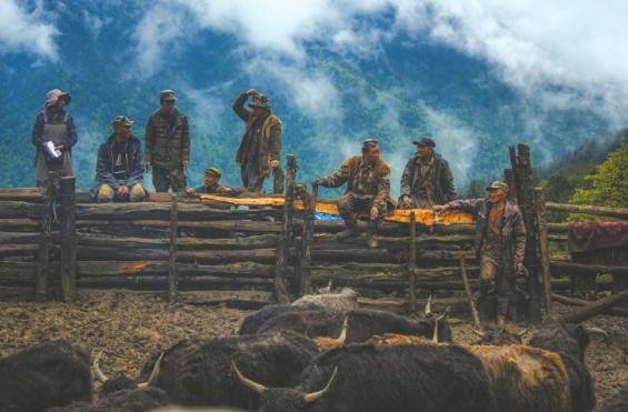 6月8日,气温骤降,夹金山上大雪纷飞,阵阵牦牛叫声在山间回响。经过两个多小时的跋涉,勒尔甲和家人们一起从高山上将一群牦牛赶往牛圈。