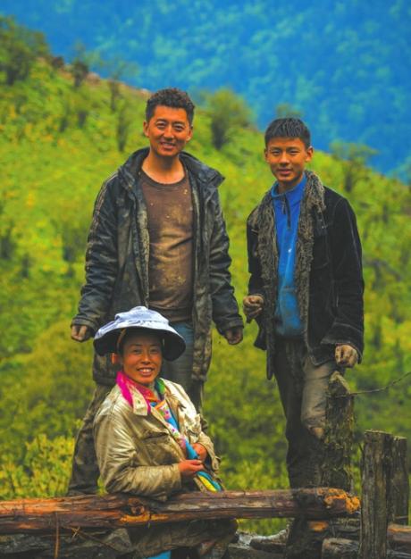 勒尔甲(后排右)、阿泰(后排左)和能卡曼一家在牛场上。
