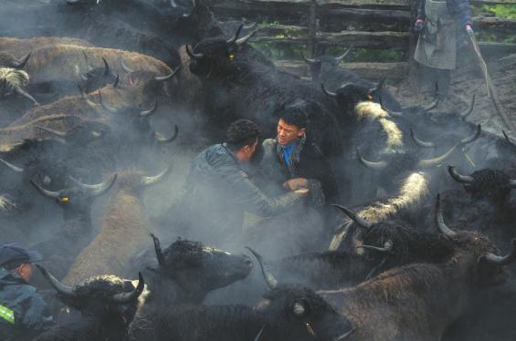 牛圈里腾起阵阵白雾,那是来自牦牛的喘息。敞放惯了的牦牛在狭小的牛圈内来回跑动,大地仿佛都在颤抖。“把牛按倒才算是长大成人了!”10多年前,勒尔甲的爷爷也是这样告诉勒尔甲的父亲阿泰的。