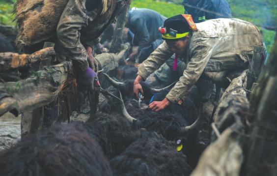 牦牛在狭小的牛圈内急速转弯,勒尔甲被抛向空中时,手里还紧紧抓住牛角不放。父亲跑上来帮忙,一人抓住牛尾巴,一人抓住牛背。他们喊着号子,把牦牛引向平坦的地方,同时用力,把牛放倒在地。“逮牛靠的是技巧和配合,单凭蛮力,无法成功。”阿泰告诉勒尔甲。在一旁等候多时的家人们一拥而上,拿起剪刀迅速上前,蹲在牛身旁剪起毛来。他们还会在牛角上做记号,给每头牛建立档案。剪下来的牛毛全部装入口袋中,勒尔甲的母亲能卡曼会和村里的妇女们把牛毛织成线,制成背心、毯子、电脑包等生活用品。