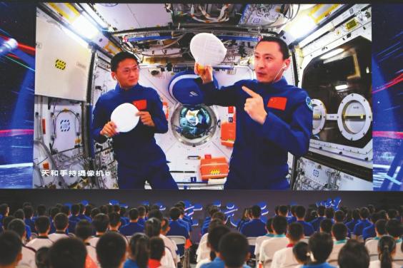 2023年9月21日,北京航空航天大学学生收看神舟十六号航天员在中国空间站“天宫课堂”授课。