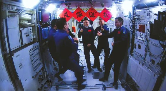 2023年10月26日,神舟十七号3名航天员顺利进驻中国空间站。图为神舟十七号航天员乘组给神舟十六号航天员乘组点赞。