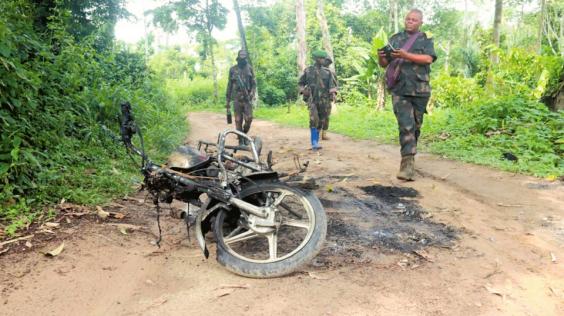 6月11日,在刚果(金)东部北基伍省贝尼地区,刚果(金)士兵巡逻时经过一辆被毁的摩托车。 图据新华社客户端