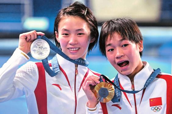 赛后颁奖,全红婵(右)露出调皮的表情。 图据CFP