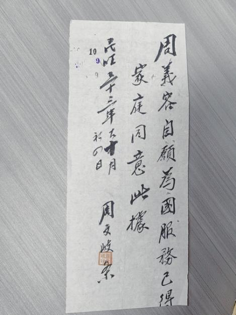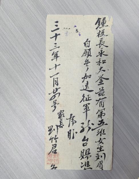 这张字据是这样写的:“永和校长台鉴:兹有贵校女五班学生钟开慧自愿从军,即希保证申送至为荷。学生家长:钟义元启”。