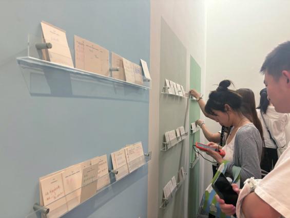 在展览的最后,还有一系列互动问答吸引观众拿起卡片和笔,留下自己的“答案”。观众还可以将卡片放置在互动架上供其他人阅读,完成与陌生人的浪漫“邂逅”。