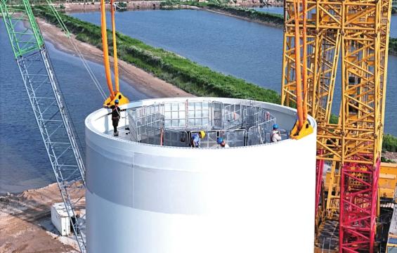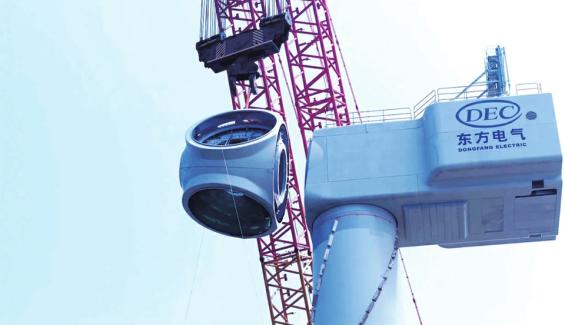 正在吊装的风力发电机。图据中国东方电器集团有限公司