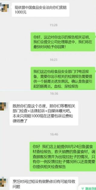 李女士说,店内工作人员起初积极地回应和处理此事,表示能提供8月24日鱼蛋食材的查检报告,包括其他顾客吃了同样的食材并没有反馈有拉肚子的情况,希望该食客提供相关的检查报告,包括诱发肠胃炎的原因。该食客回应称,拉肚子的原因有可能是烹饪时间过短、没有做熟。