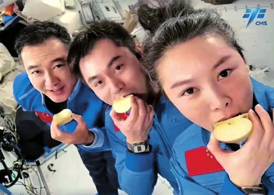 神舟十三号航天员乘组在轨食用苹果。 图据中国载人航天微信公众号