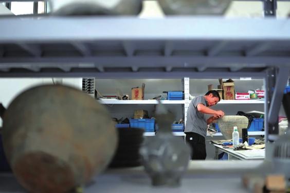 工作人员在陕西省考古研究院秦汉考古基地修复秦咸阳城遗址出土文物。