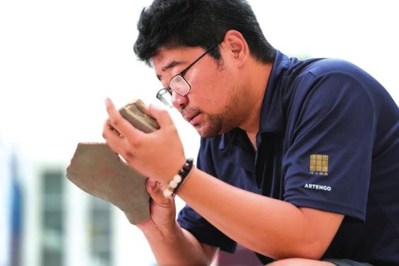 秦咸阳城遗址考古项目负责人、陕西省考古研究院副研究馆员张杨力铮仔细观察考古发掘出的陶片。