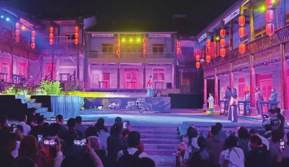 夜幕降临,大型沉浸式表演《葭萌春秋》拉开帷幕。无主舞台流水线形式演出,游客跟随演员穿行其间,再借助全息投影与实景舞美,将千年历史浓缩于街巷院落之间。