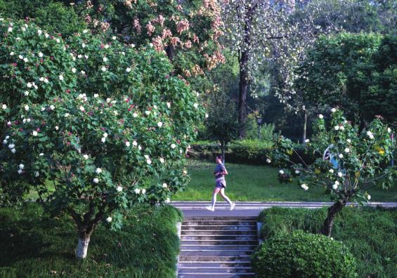 2025年10月15日,成都金沙滨河公园,一位锻炼的市民从芙蓉花下跑过。 杨涛 摄