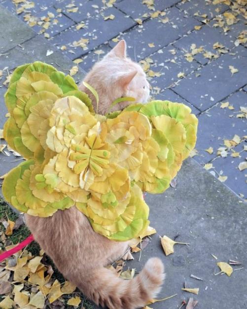 张女士的小猫背着银杏叶翅膀。 受访者供图
