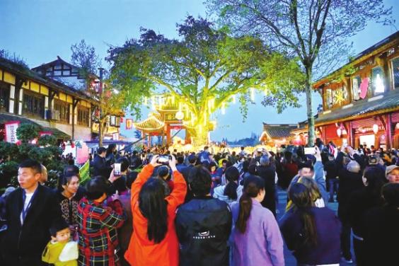 近年来,元通古镇以清明春台会为核心IP,积极探索“非遗+”融合路径。尤其在延续春台会要有戏看的传统习俗上,引进了国内知名喜剧团队“开心麻花”,推出了沉浸式体验演艺《会馆往事》《捞金晚宴》《锦城绮梦》等剧目。这些免费惠民演出涵盖即兴喜剧、肢体剧等多种形式,为传统节庆注入了新鲜艺术活力。