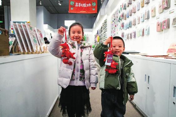 1月26日晚,在甘肃省博物馆文创商店,小朋友展示刚购买的新款马踏飞燕贺岁毛绒玩偶“红运当头马”。