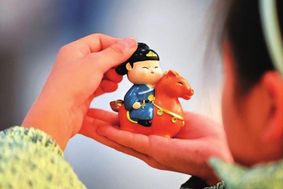 1月17日,在山东滕州博物馆文创商店,一个小朋友选购“踏马游春”文创摆件。