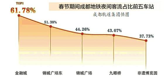 金融城站以61.78%的夜间客流占比领跑全城,锦城广场东站(51.38%)、锦城广场站(44.26%)、九眼桥站(43.07%)、非遗博览园站(37.73%)紧随其后。
