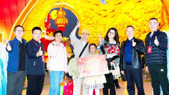 杨女士(右3)成为第32届自贡国际恐龙灯会的第100万名游客。