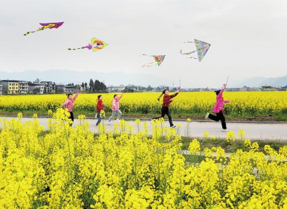 3月14日,在达州市开江县普安镇新河村“黄金花海”景区,普安镇中心小学学生在油菜花田旁放飞风筝。新华社发