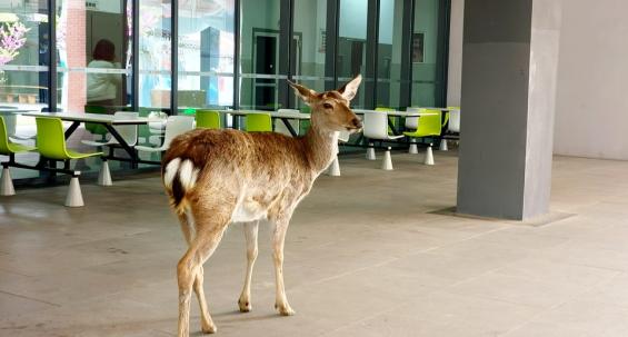 当中午放学的钟声响起,学生们涌入食堂吃饭,此刻“明星小鹿”也慢悠悠地走到食堂边上闲逛,学生们习以为常。一些学生路过还会特意喊一声“呦呦”,并抚摸一会儿小鹿后再满意离开。